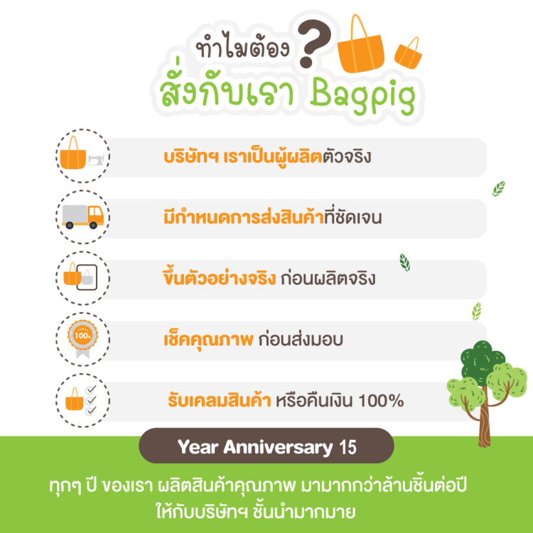 และในทุกๆ ปีของเรา เราได้ผลิตสินค้าที่มีคุณภาพ มีดีไซน์ ไม่จำเจ ไปมากกว่าล้านๆ ชิ้น "ถุงผ้า กระเป๋าผ้า ของ Bagpig คนให้ภูมิใจ คนรับถูกใจ"